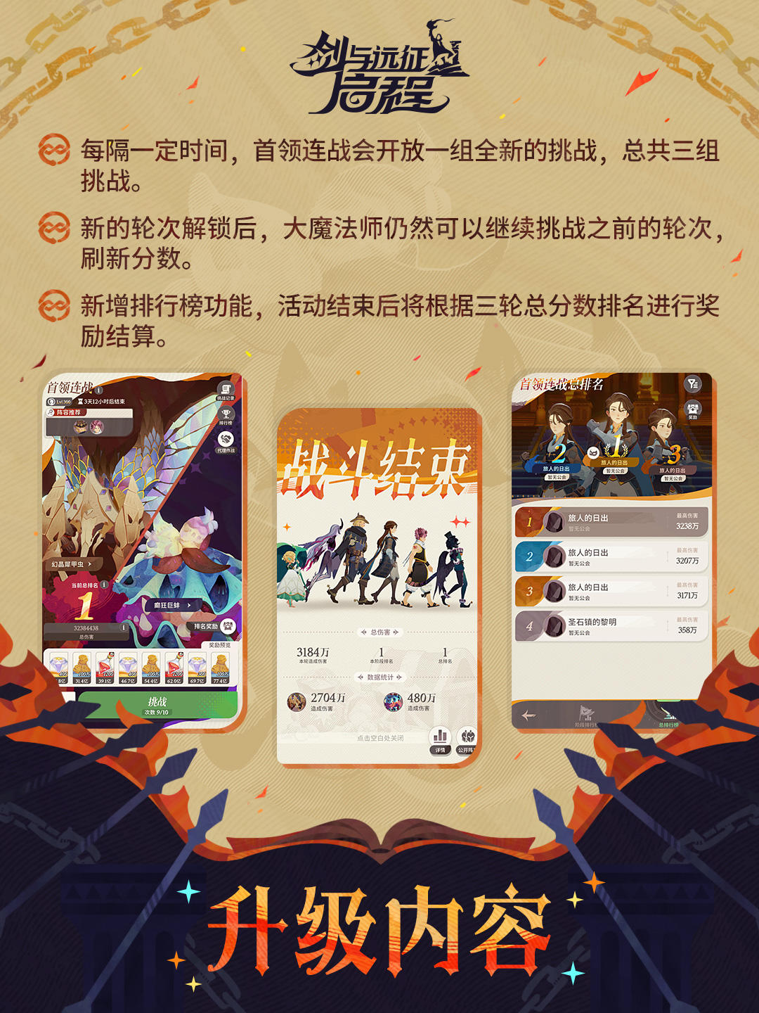 - 本次首领连战将新增排行榜功能,活动结束后将根据三轮总分数排名进行奖励结算。
