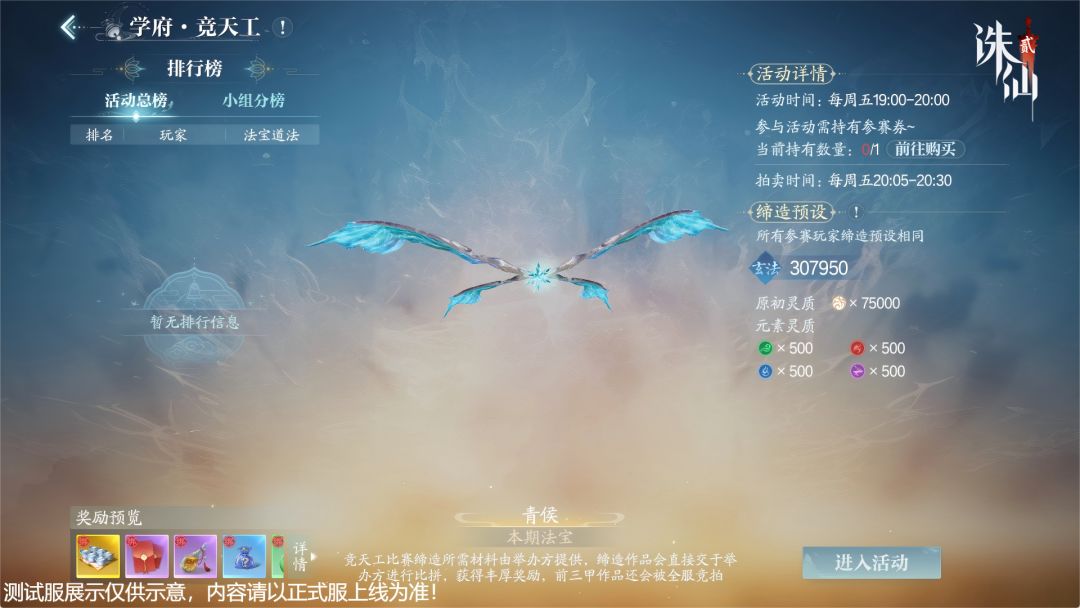 谁说炼宝只是土豪的游戏?仙枢院全新玩法 「学府·竞天工」 上线,真正实现绝对公平的炼宝舞台!在此,系统将免费提供所有缔造材料,所有玩家使用统一的默认模板,全心比拼对炼宝之道的领悟。每人拥有两次机会,最终以法宝蕴含的“道法”论高低,仙友们仅需购买门票即可参与活动。炼宝大神的你不仅可以赢得大量仙钞奖励,当期活动道法排名前3的法宝更将进入全服拍卖,收入税后全额分红给排名靠前的仙友!海量银锭收入,一夜暴富不是梦,只为擅长炼宝的你~