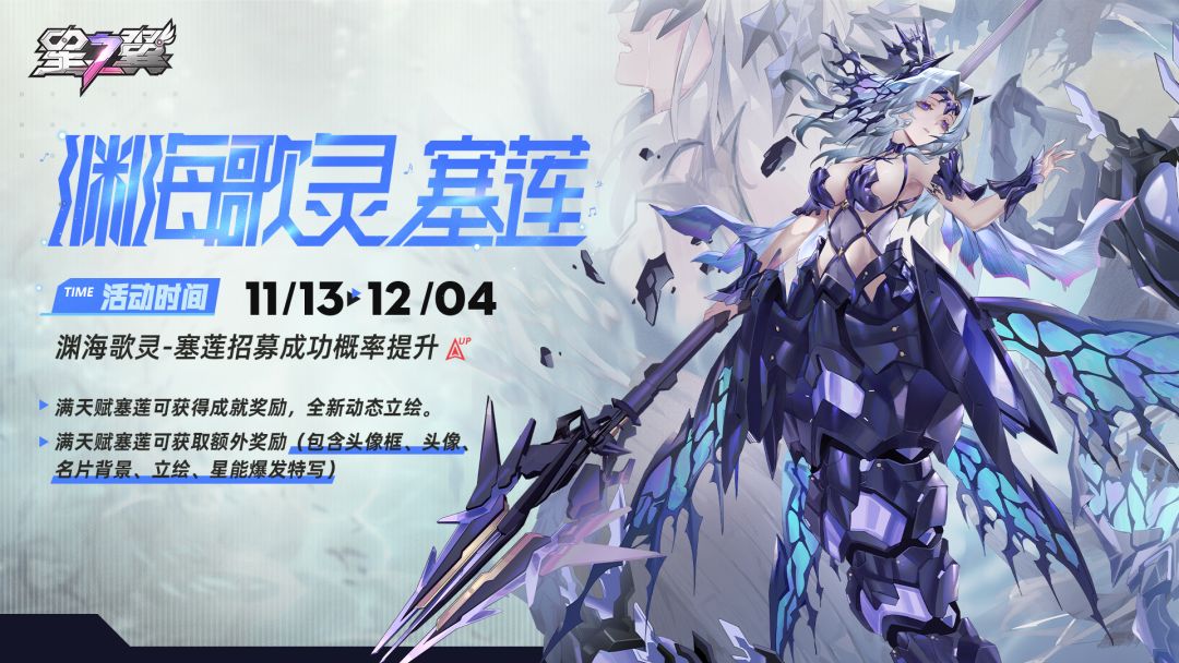 活动期间,角色【渊海歌灵-塞莲】招募概率提升!团长可参与「渊海歌灵-限时UP 50%卡池」和「渊海歌灵-限时UP 100%卡池」两种类型的招募活动。