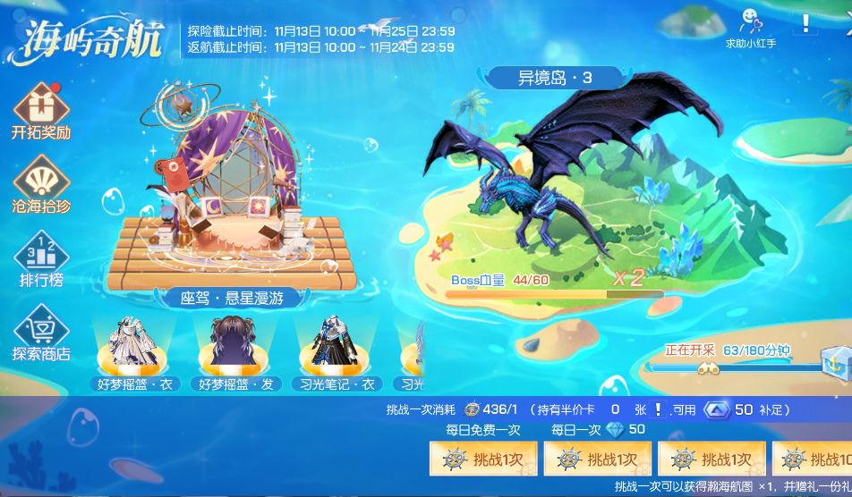 11月13日至11月25日23:59,可以参与海屿奇航获得座驾图纸·悬星漫游、时装·好梦摇篮·衣、发型·好梦摇篮·发、头饰·好梦摇篮·头饰、返场时装·习光笔记·衣、返场发型·习光笔记·发、返场头饰·习光笔记·头饰、聊天气泡、聊天背景、头像、耳环、足印等奖励。勇士肃清怪兽后,可领取荒骨遗匣嘉奖,探索已肃清海岛获得丰厚超值奖励,同时获得灵岛赐福,额外赠送超值奖励一份!每个海岛都蕴藏稀有矿脉,探索完成即可开启开采,海量钻石、金币轻松入账。11 月 24 日 23:29 返航前,每日 0 点起每 180 分钟将自动结算一次开采收益,奖励直接累积,最多可储存 8 次,千万别错过!