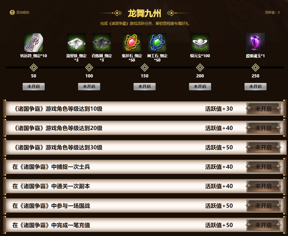 完成《诸国争霸》游戏内活跃任务获得积分,解锁多重里程碑奖励!装备强化道具、银元宝、殷紫魂玉等道具等你来领取!