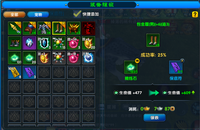 强运符可提升强化与追加10%成功率,侠客令第四档更能额外叠加5%成功率,高阶段冲刺必备属性石头镶嵌:属性石头可镶嵌装备,直接增加气血、真气、攻击力、防御及各类抗性,失败仅会重置至0级,装备不会消失,用强运符可提升镶嵌成功率,零风险稳步增益。