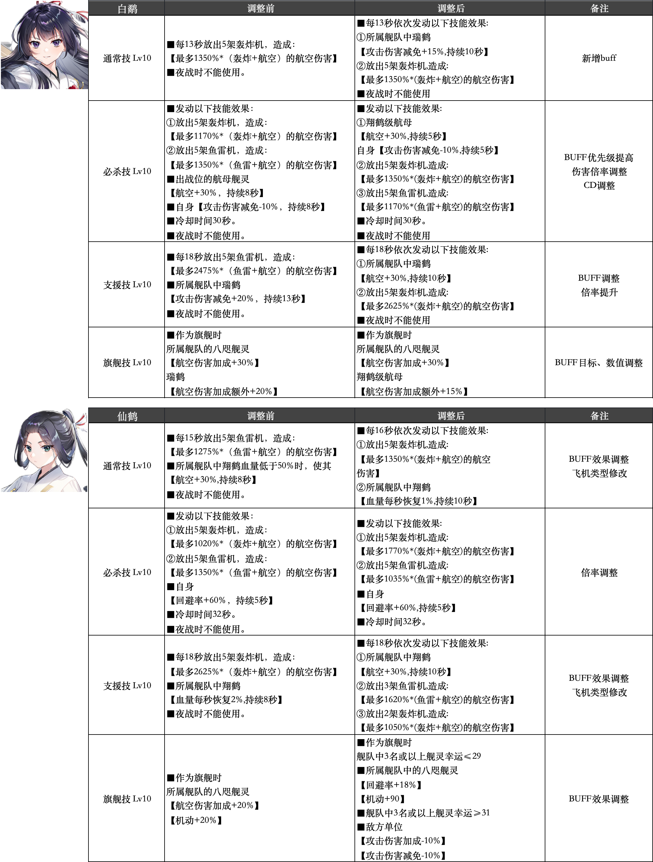 5、舰灵技能优化:对「白鹬」「仙鹤」的技能进行了调整优化,具体调整内容请参见下方表格说明: