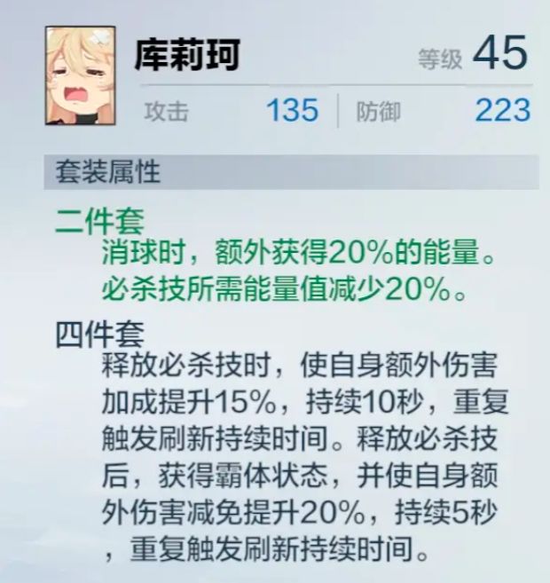 雷队:2 库莉珂 + 4 海森。库莉珂 2 件套减必杀能量,4 件套增伤;海森提升雷伤和感电,完美适配雷系输出。