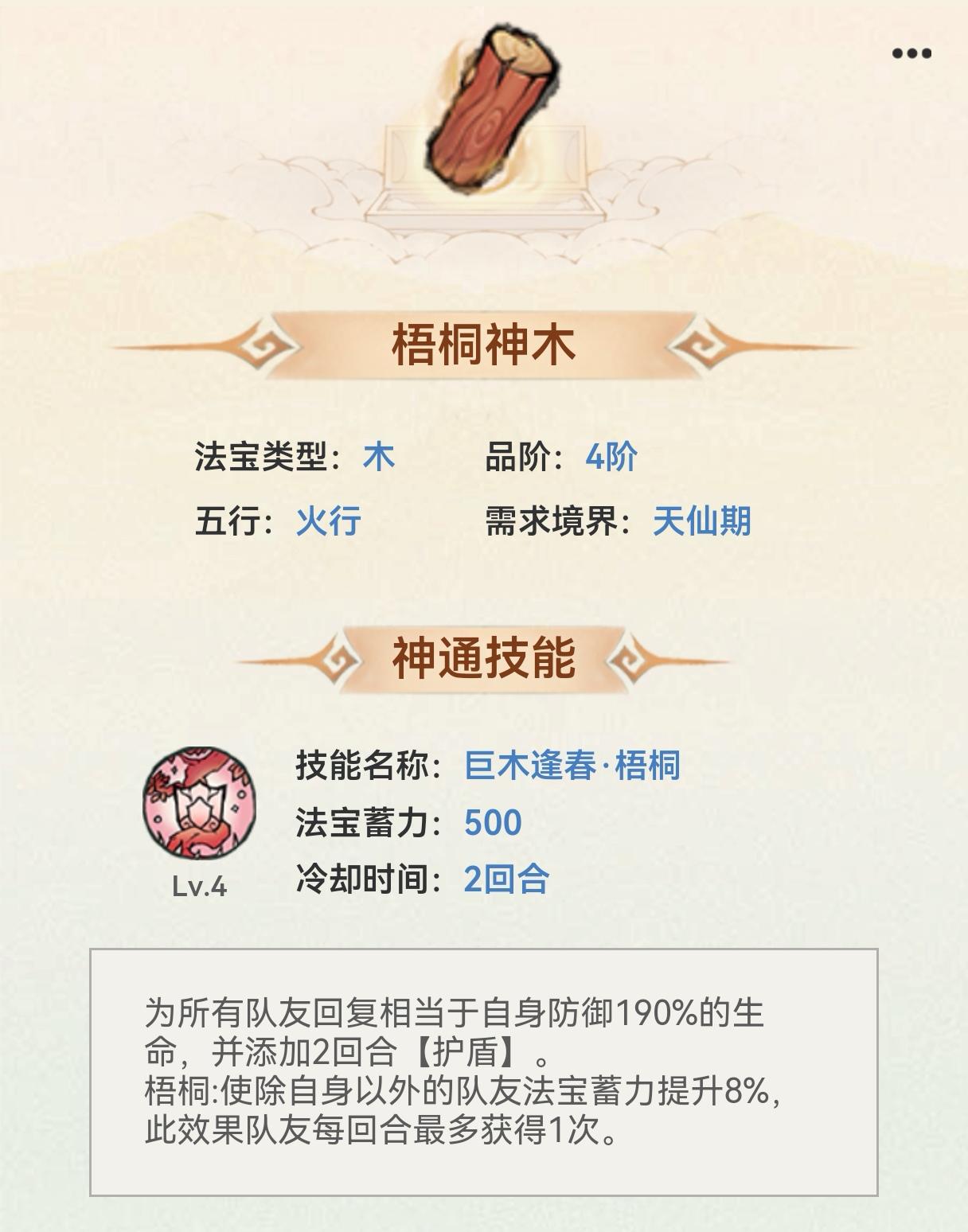 梧桐:使除自身以外的队友法宝蓄力提升8%,此效果队友每回合最多获得1次。