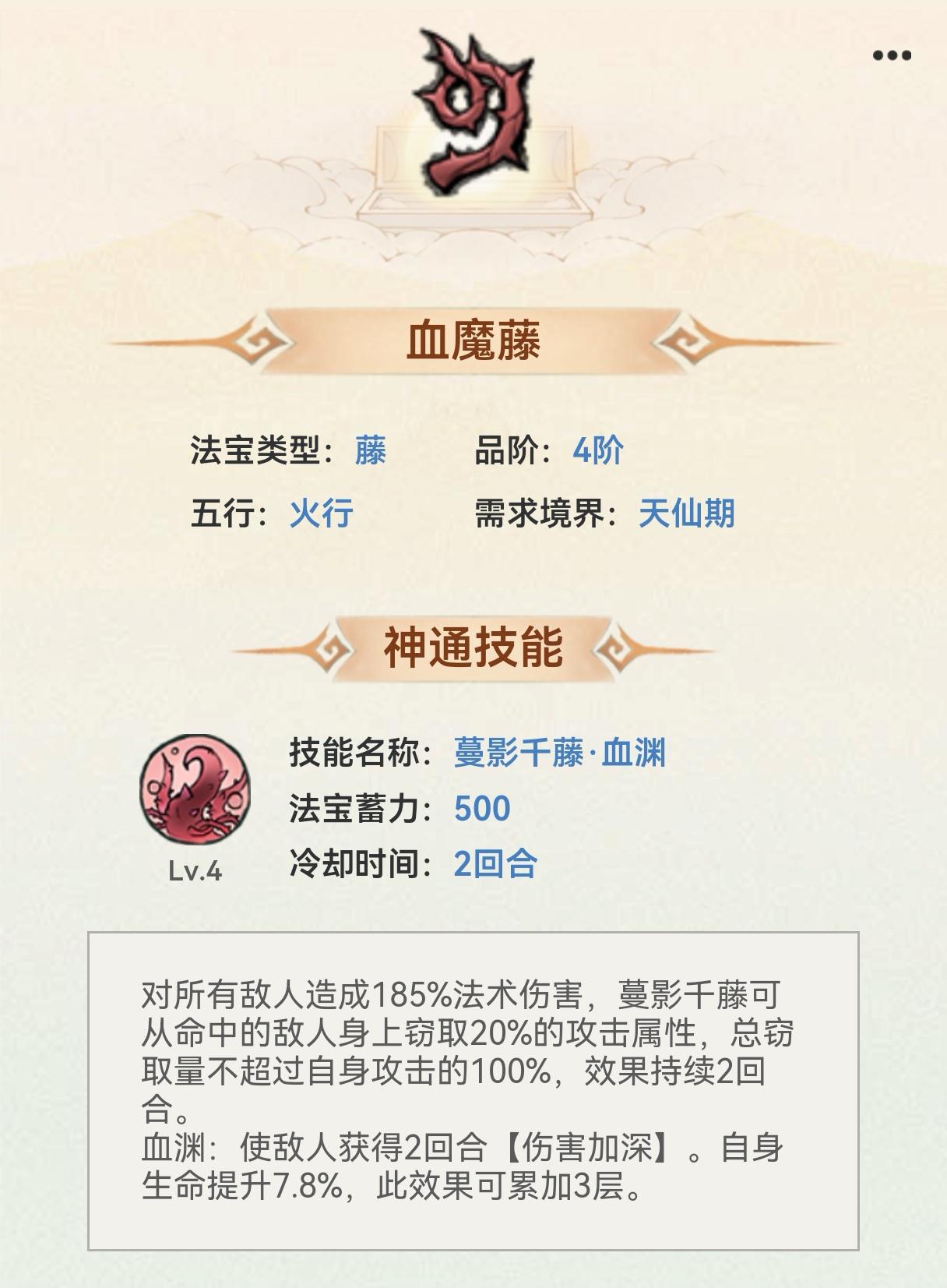 2. 蔓影千藤·血渊:对所有敌人造成185%法术伤害,蔓影千藤可从命中的敌人身上窃取20%的攻击属性(总窃取量不超过自身攻击的100%),效果持续2回合;