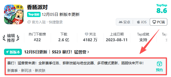 入口二:进入「香肠派对详情页」,在详情栏中下拉到新版本,单击下方的「SS23暴打!猛兽营」即可进入“新版本预约”界面