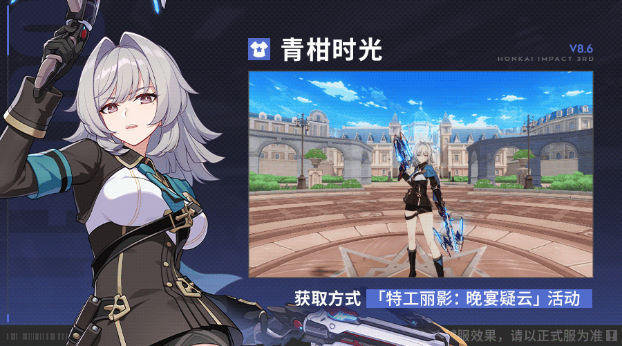 在8.6版本中,舰长可通过参与「特工丽影:晚宴疑云」活动获取全新服装「青柑时光」。