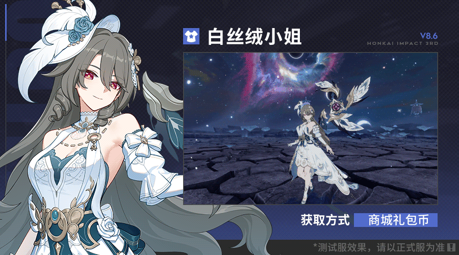 在8.6版本中,舰长可前往服装商场使用礼包币获取全新服装「白丝绒小姐」。