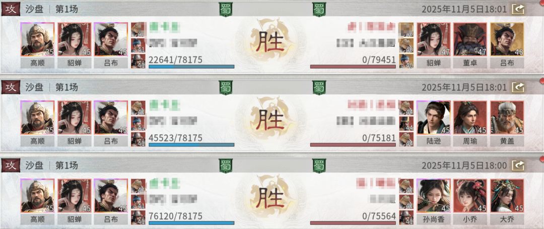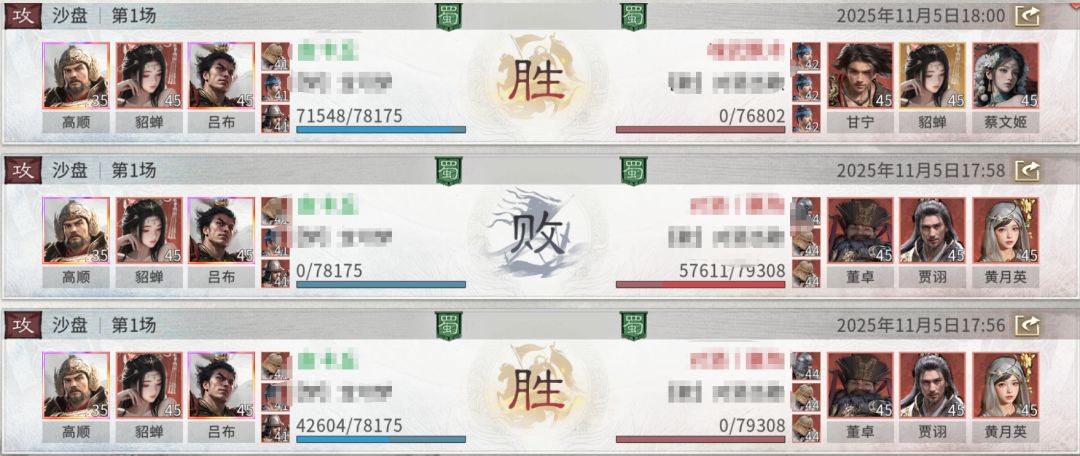 二.战报以及克制关系这个阵容的上限非常高,但是非常需要加属性的宝物,让貂蝉的魅力以及高顺的统帅比敌方都高,否则是无法触发额外追击的。同时这个阵容很怕控制,一旦吕布吃到控制技能,这个阵容就没有别的输出,所以建议尽可能规避以贾诩、诸葛亮、董卓为代表的控制队。