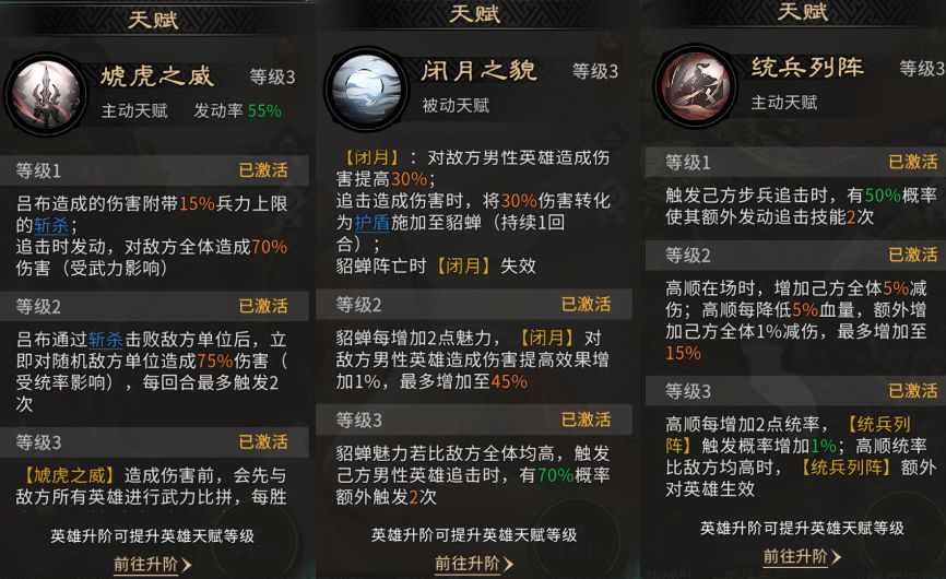 队伍思路为:吕布的天赋技能【虓虎之威】需要在追击时才能发动,可以对敌方全体造成伤害,并且吕布造成的伤害有斩杀效果。