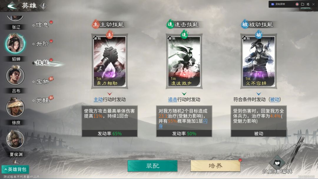 被动技能:推荐携带【义不容辞】,受到伤害时,回复我方全体兵力。我们貂蝉是站在前排的,可以持续触发这个被动。