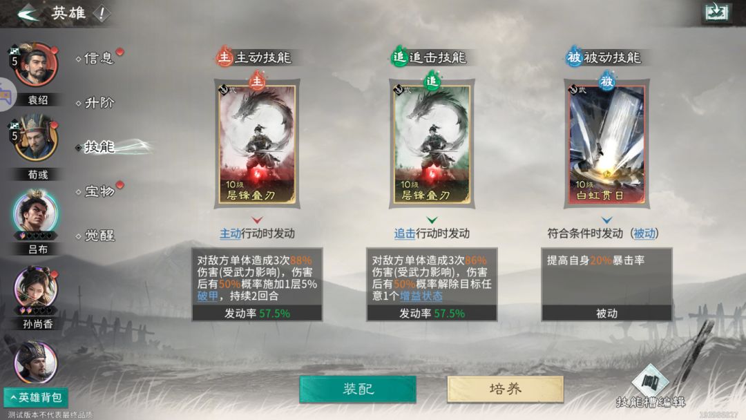 这里若时吕布升至彩色品质推荐将主动技能槽变为追击技能槽,同样装备【层锋叠刃】