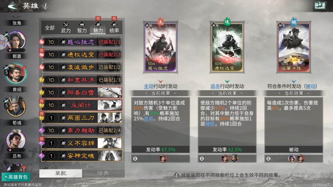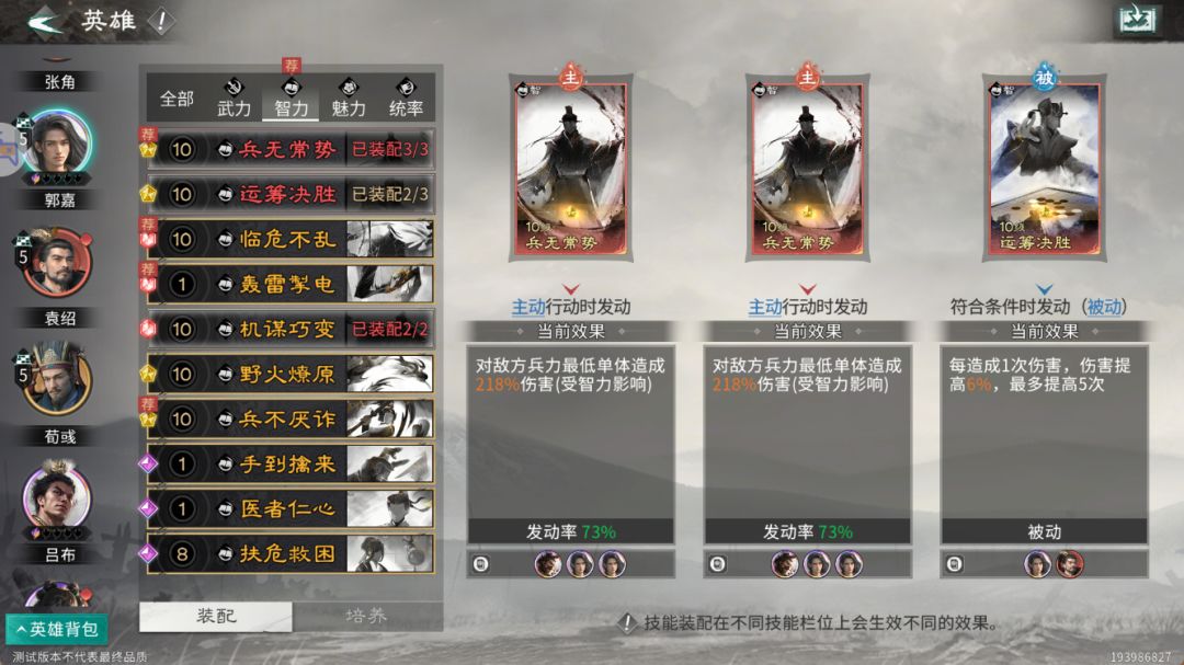 (因为当前郭嘉没有踩追击格无法发动追击技能,如果当郭嘉品质到达炼彩时,推荐将追击技能修改为主动技能,从而获得更暴力的输出效果。)
