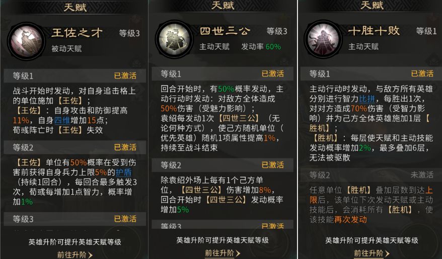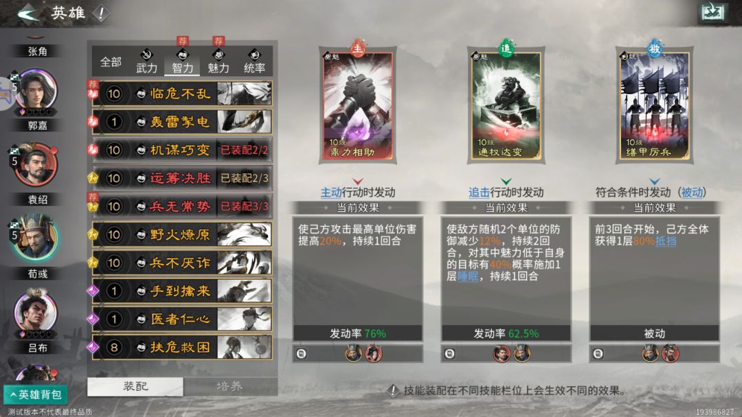 主动技能:推荐携带鼎力相助,提升己方攻击最高单位的伤害。因【王佐】效果已强化袁绍,此技能可进一步提高其输出。