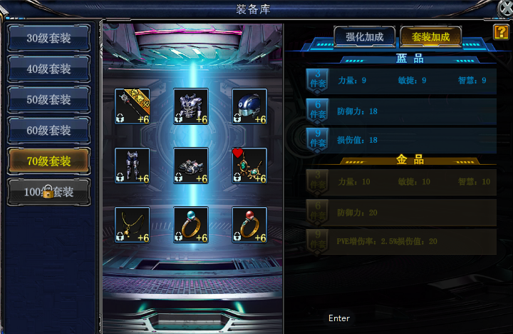 前期过渡不盲从:装备更替较快,优先打造一套+4装备过渡即可,强化石留到后期用于高阶装备,避免资源浪费。 装备库激活属性:角色30/40/50级将解锁对应等级套装栏位,放入指定装备可激活属性加成(如蓝色3件提力量、金色6件加防御),强化过的装备还能触发“强化共鸣”,额外提升生命与攻击。
