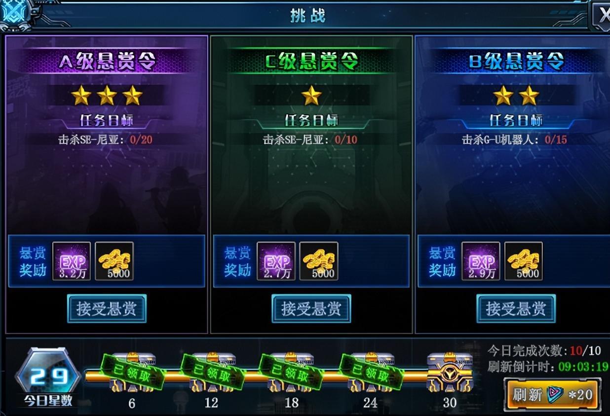 悬赏任务选高星:每日免费刷新3次,优先接取高星级任务,难度略高但奖励更丰厚,助力快速积累资源;