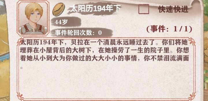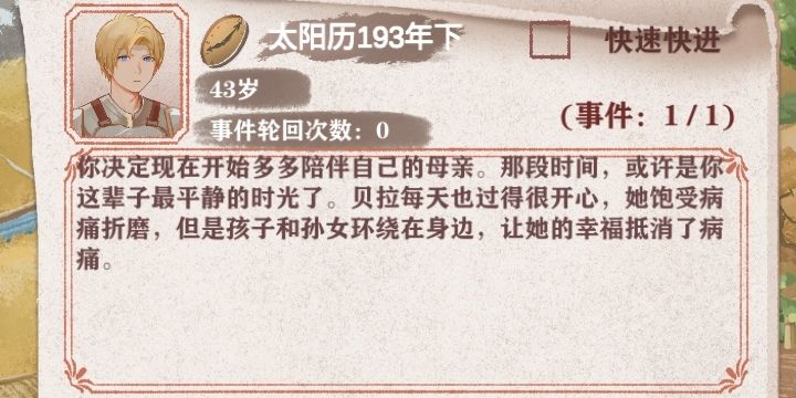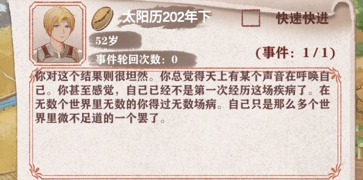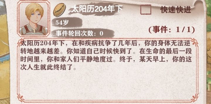 · 在和疾病抗争了几年后,你的身体无法逆转地越来越差。你知道自己时候快到了。在生命的最后一段时间里,你和家人们平静地度过。终于,某天早上,你的这次人生就此终结了。