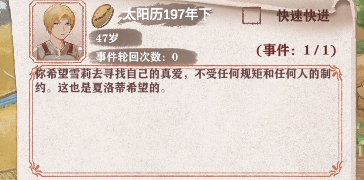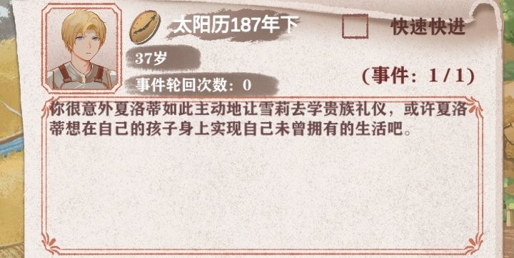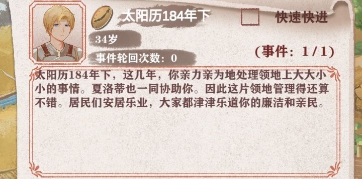 · 这几年,你亲力亲为地处理领地上大大小小的事情,夏洛蒂也一同协助你。因此这片领地管理得还算不错,居民们安居乐业,大家都津津乐道你的廉洁和亲民。