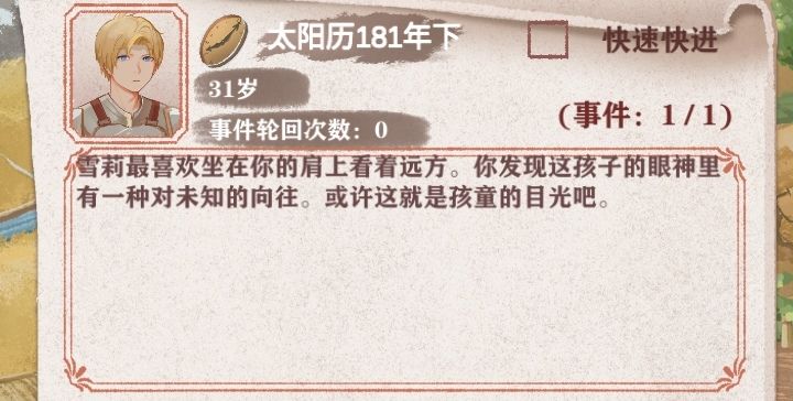 · 雪莉最喜欢坐在你的肩上看着远方。你发现这孩子的眼神里有一种对未知的向往,或许这就是孩童的目光吧。