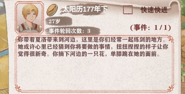 · 你带着夏洛蒂来到河边,这里是你们经常一起练剑的地方。她或许心里已经猜到你将要做的事情,扭捏捏的样子让你觉得很新奇。你摘下河边的一只花,单膝跪在她的面前。