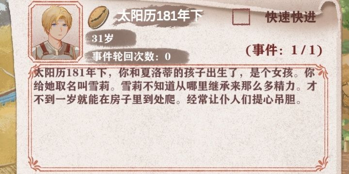 · 你和夏洛蒂的孩子出生了,是个女孩,你给她取名叫雪莉。雪莉不知道从哪里继承来那么多精力,才不到一岁就能在房子里到处爬,经常让仆人们提心吊胆。