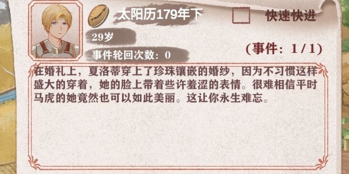 · 你迎来了这辈子最为重要的一天:你和夏洛蒂举办了盛大的婚礼。王国的领主们纷纷派来了使者来见证你们的结合,同时还送上了十分精美的珍宝,看来都巴不得讨好你。