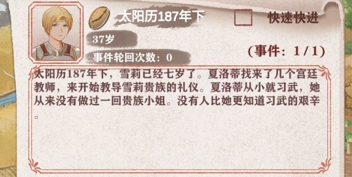 · 雪莉已经七岁了。夏洛蒂找来了几个宫廷教师,来开始教导雪莉贵族的礼仪。夏洛蒂从小就习武,她从来没有做过一回贵族小姐,没有人比她更知道习武的艰辛。