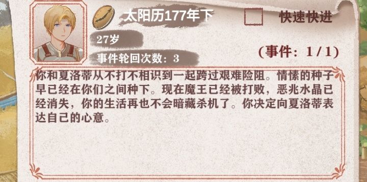 · 你和夏洛蒂从不打不相识到一起跨过艰难险阻,感情的种子早已经在你们之间种下。现在魔王已经被打败,恶兆水晶已经消失,你的生活再也不会暗藏杀机了。你决定向夏洛蒂表达自己的心意。
