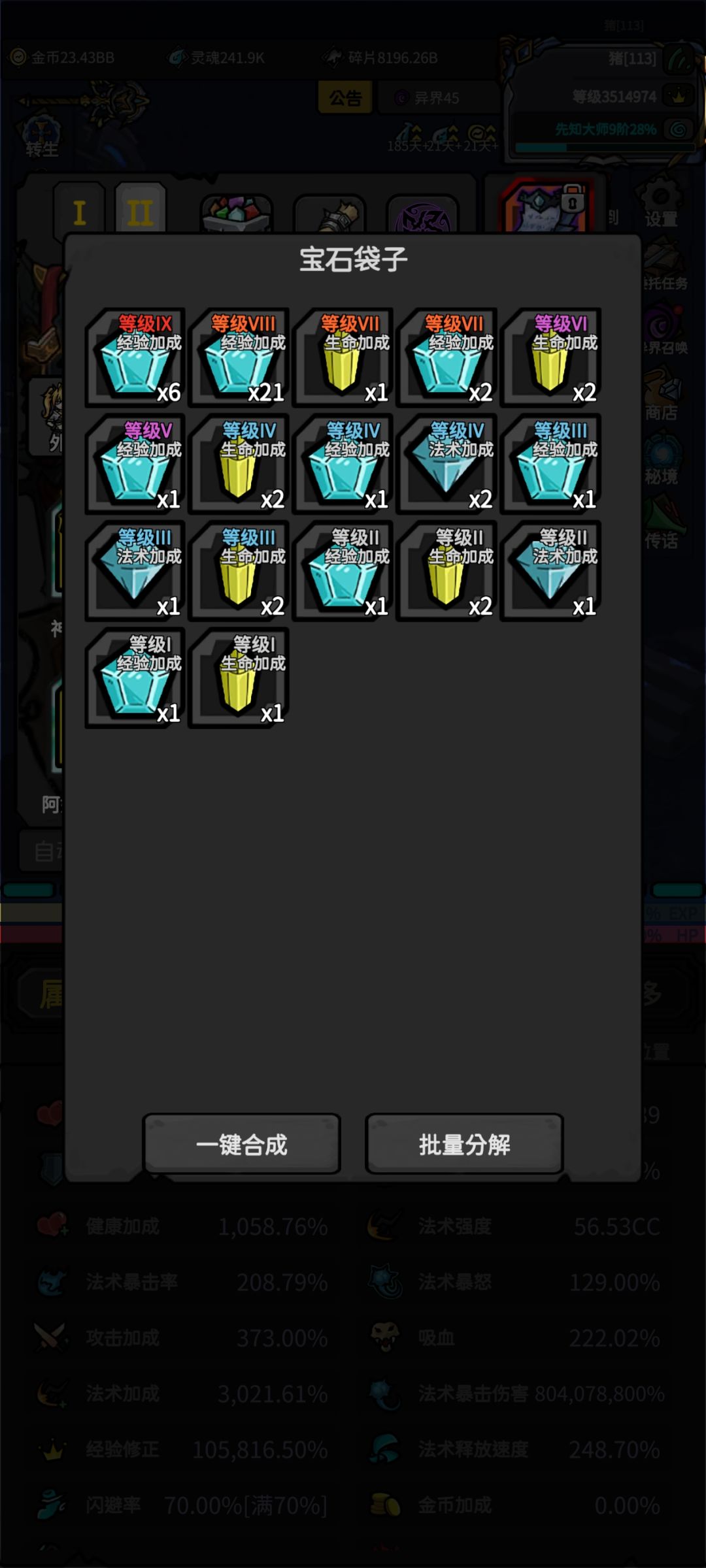 ,在换上了4本橙天赋全血血书后带上了12个健康宝石,其余全部法术加成宝石,御灵全伤害,宠物装备换成了血量百分百加成外带一个暴怒加成,