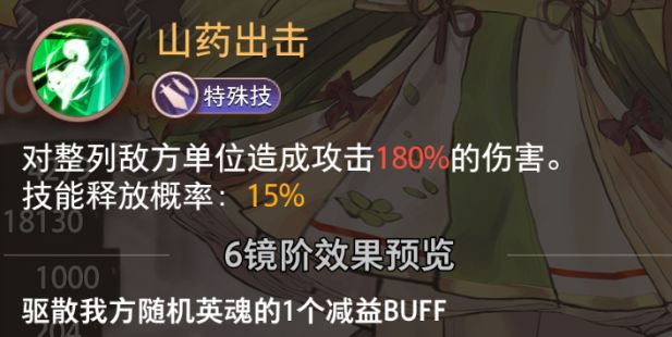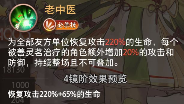 为全部友方单位恢复攻击220%的生命,每个被善灵茗治疗的角色额外增加20%的攻击和防御,持续整场且不可叠加。