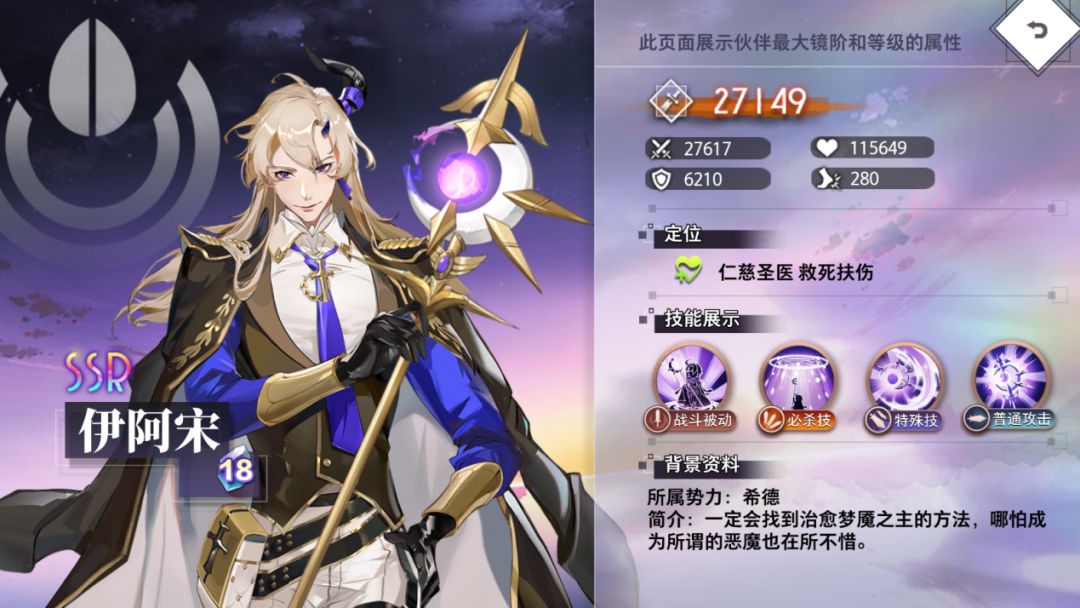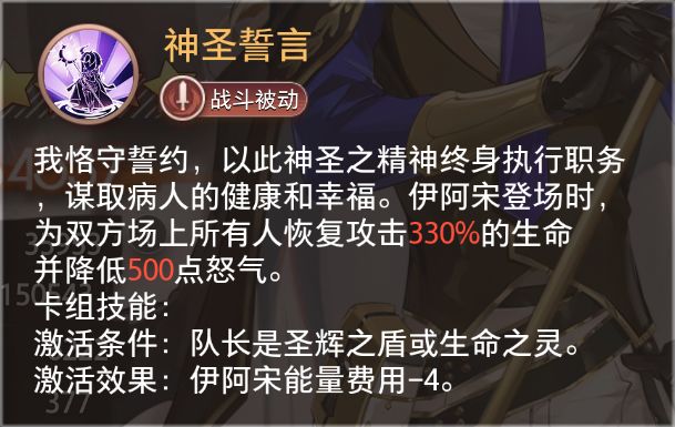 我恪守誓约,以此神圣之精神终身执行职务,谋取病人的健康和幸福。伊阿宋登场时,为双方场上所有人恢复攻击330%的生命并降低500点怒气。