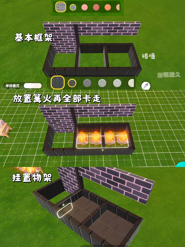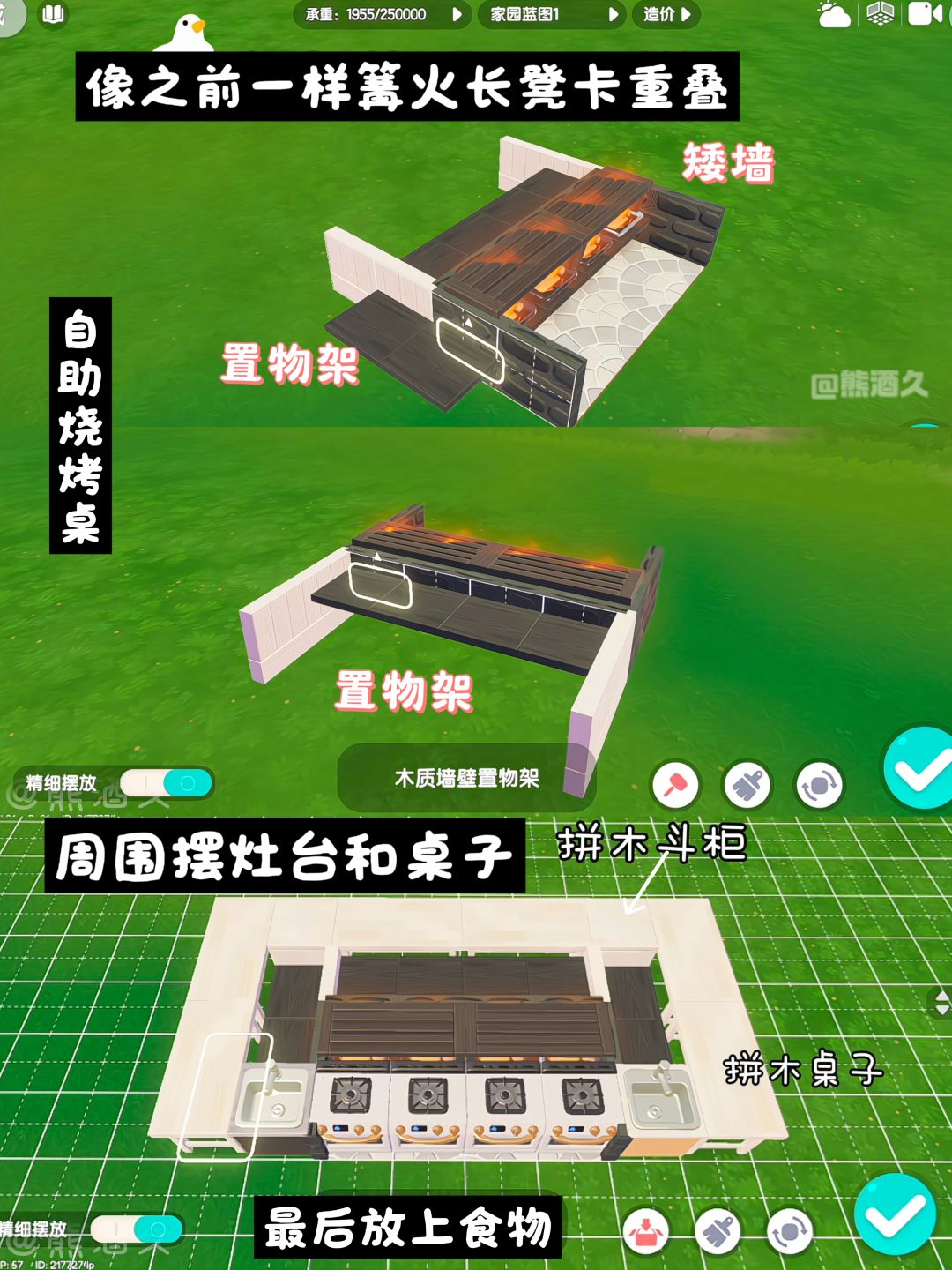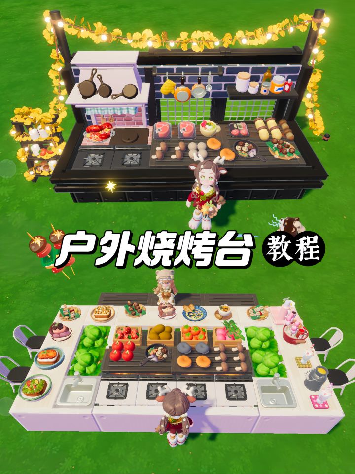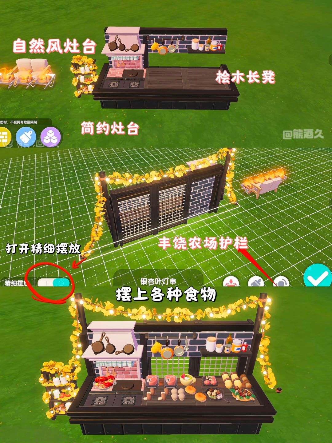 主要建材家具:栖野简易篝火、置物架、金属墙壁装饰、自然风灶台、简约灶台、桧木长凳、拼木壁挂调料架、墙面挂架、蔬果架装饰灯、丰饶农场护栏、银杏叶灯串、拼木桌子、拼木斗柜。