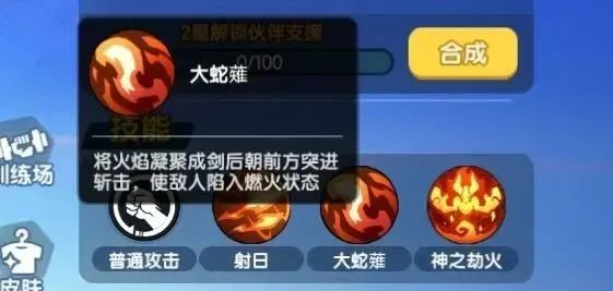 3.大蛇薙:将火焰凝剑突斩,使敌人燃火,是小段位移技能,可衔接普攻击退,也能挂燃火状态,连招为1技能→闪现→2段普攻→2技能→2段普攻→闪现→1技能循环。