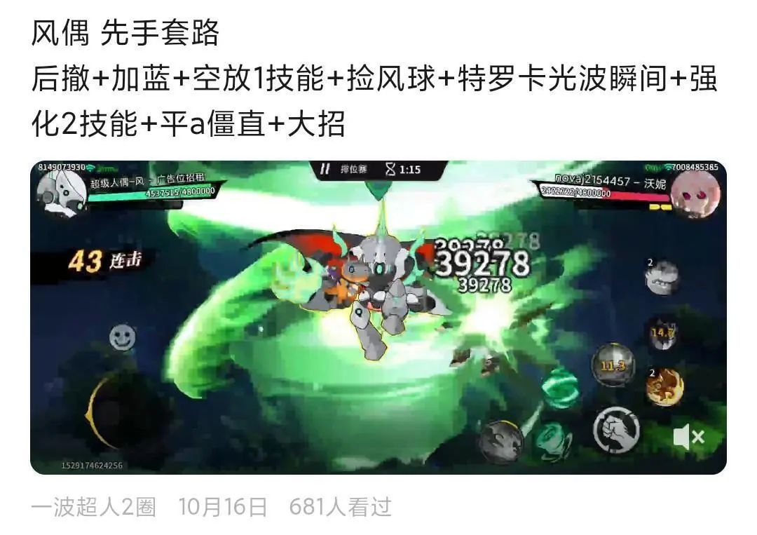 3.大招最后就是大招也不用多少,就是抓一下进行大量伤害。注意的是这个大招会把人吸过来,所以不容易空,此外大招结束如果在墙边可以接1,在空地可以接强化二。总而言之,风之偶是一个非常强的角色,并且伤害也很高,在陷入僵局也可以自己收集风球,利用强化二打一个出其不意,也可以用强化1和强化2消耗对手,因为风之偶的伤害也是很高。对于密卷可以带迷惑光线作为一个强起手。