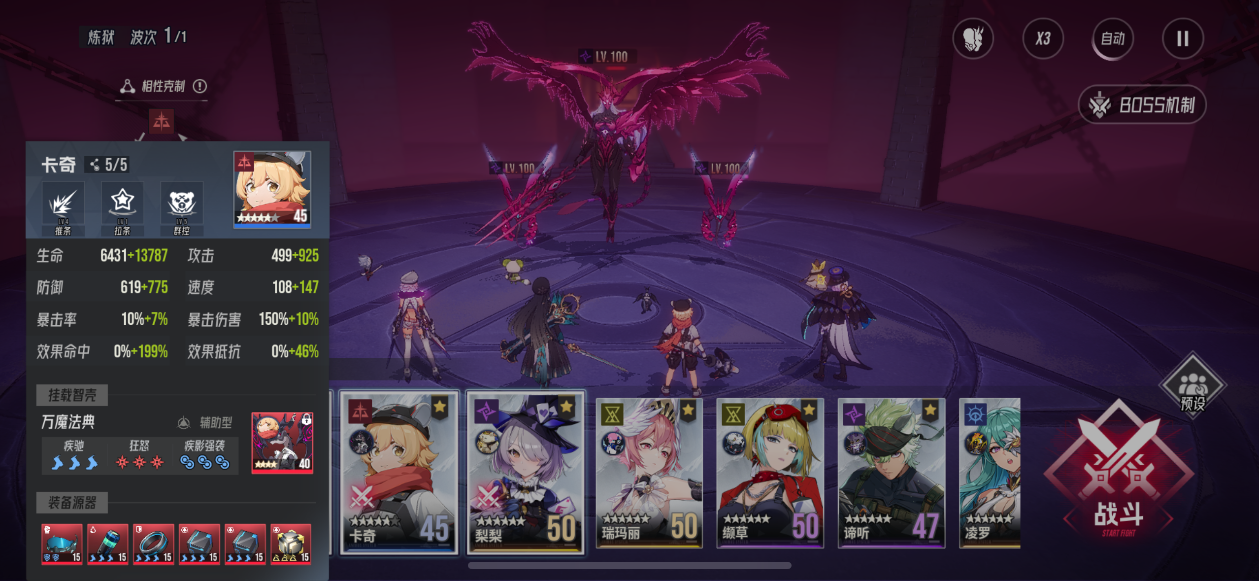 阵容是经过专门的调速,经过测试并不是越快越好,一速火卡奇,最好速度250-260速之间,纸壳万魔法典堆命中,二速逆翎破防加伤,配二速的原因是避免逆翎先手会触发小怪反击,因为配速较低,为了防止拉姆被拉后超车所以要二速,三速梨梨,辅助均245速以上,再低没测试过,此阵容可稳定挂机,平均37s一把,除了拉姆之外,其余只要速度命中达标套装没要求