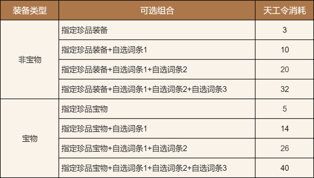 使用【天工令】和【珍品装备材料】,可锻造指定的珍品装备。