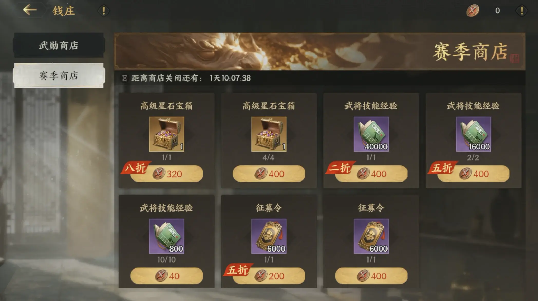 上赛季结算获得的荣誉积分记得去赛季商店兑换掉,都是实打实的好东西。优先兑换打折的武将技能经验和征募令,另外,免费的招募次数也要在赛季卡池里及时用掉。