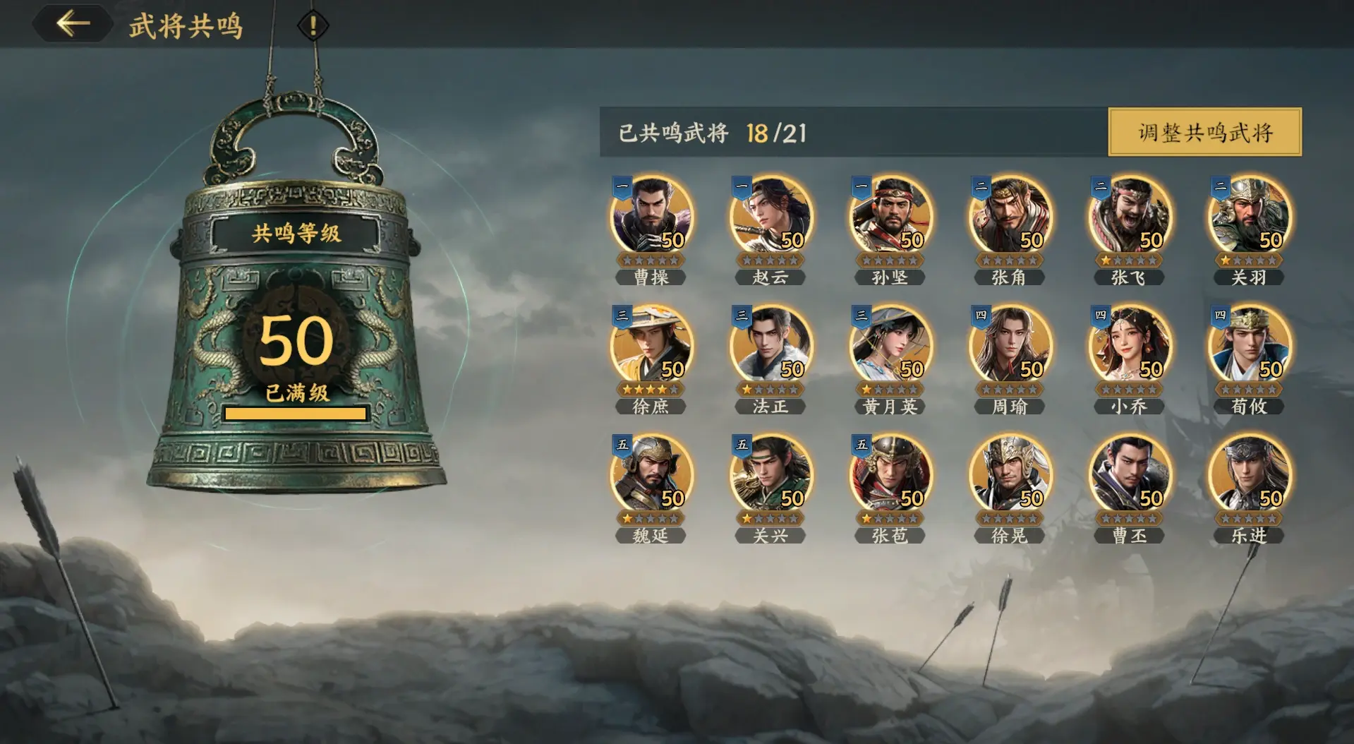 共鸣系统可共享武将最高等级,新武将无需重复培养。重置武将将返还全部已消耗资源(技能书、强化石等),方便阵容调整。
