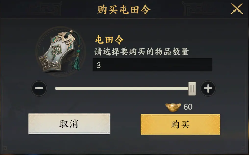 完成日常任务每日可获得80元宝,建议使用60元宝购买3次屯田次数。屯田时尽量选择当前占领的最高级土地,以最大化资源收益。