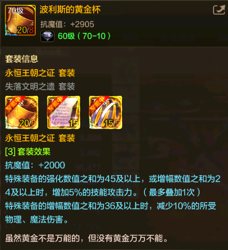 套装属性的加成与辅助装备和魔法石形成3件套效果,在这里不再重复。