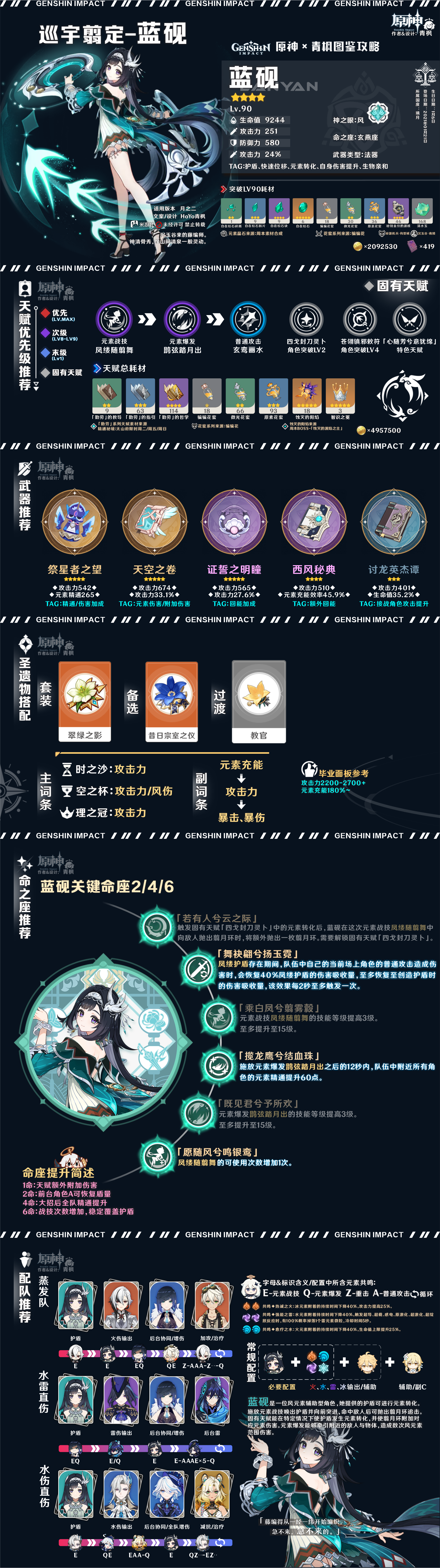 4、圣遗物板块:适配性套装/散搭推荐、主副词条推荐,结合武器板块附上毕业面板参考;