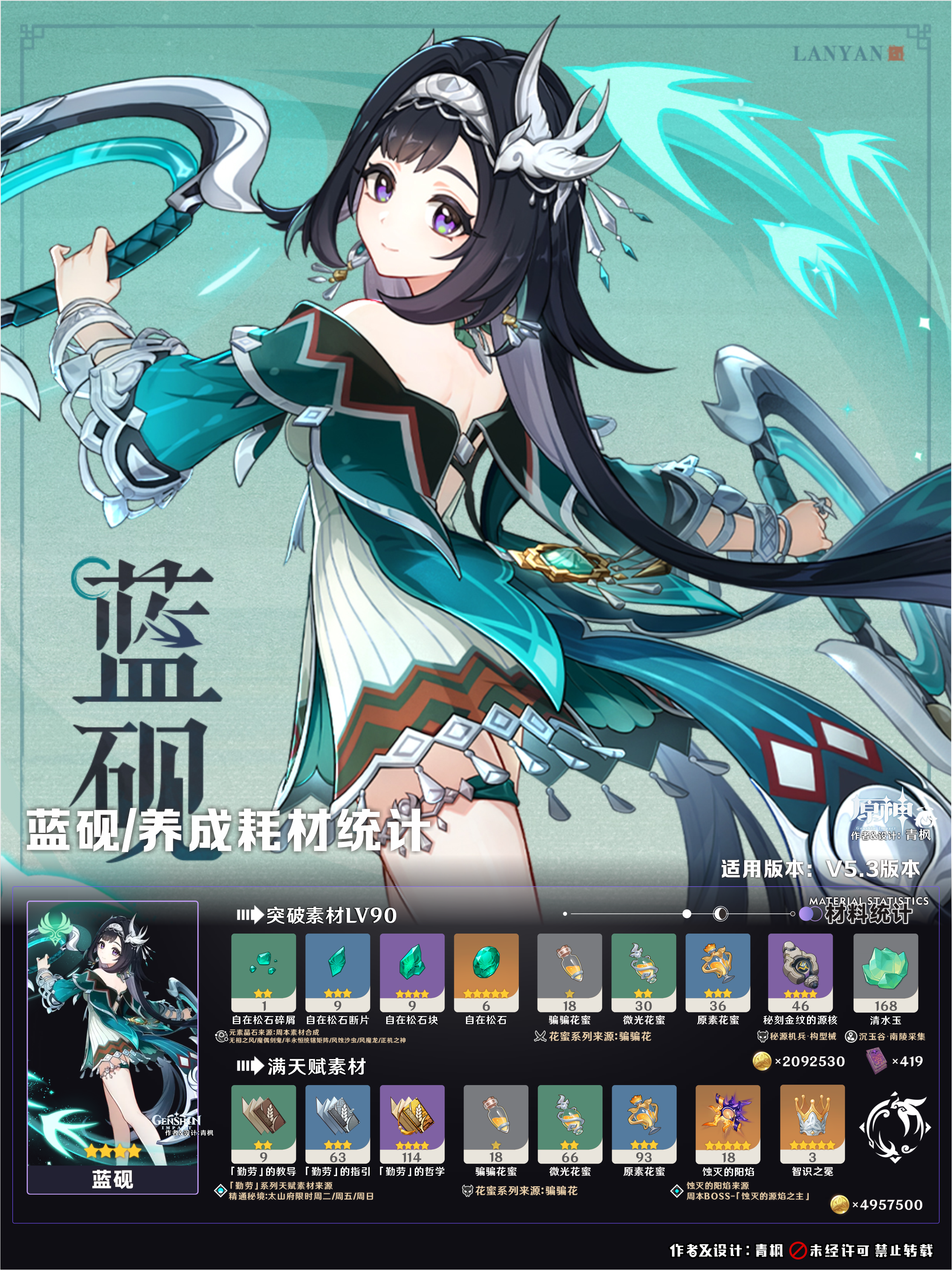 接下来以图鉴的形式简要解析「蓝砚」的养成参考,帮助大家快速了解角色及后续培养方向;