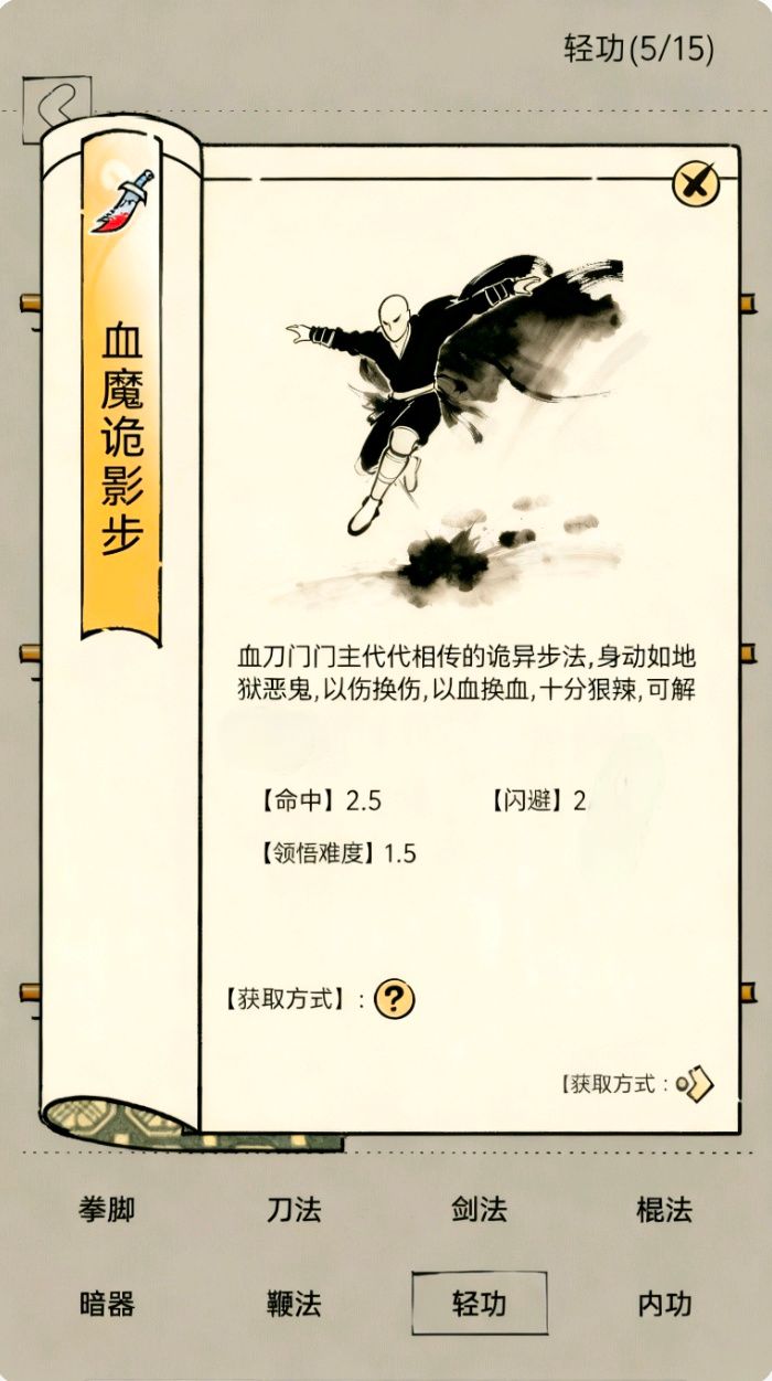 简介:血刀门门主代代相传的诡异步法,身动如地狱恶鬼,以伤换伤,以血换血,十分狠辣,可解锁1个招式