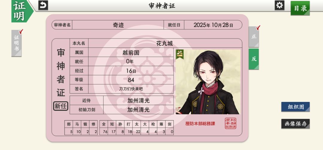 我愿称之为新人婶婶扩图鉴活动,现在的我已经是在刀账上有76把刀的婶婶了,五花刀已经全部到手了捏,除了三日月是被我锻出来的,其他全部是在这里捞到的,我永远拥护你。