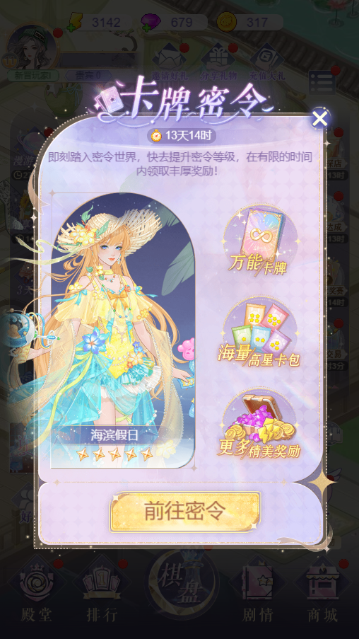◈ 花费68元解锁进阶密令并完成任务,可获得进阶密令奖励5星套装:海滨假日各部件、卡包、钻石、万能卡牌等!