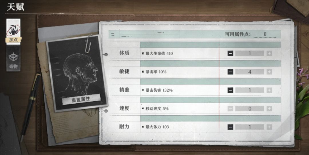 1、属性加点,角色属性分为了体力(最大生命值)敏捷(暴击率)精准(暴击上号)速度(移动速度)耐力(最大体力)5类!