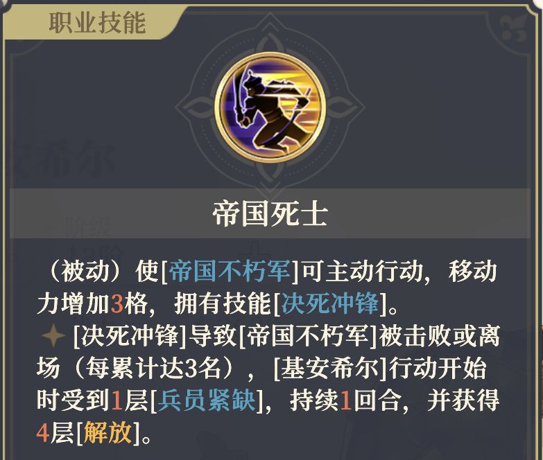 - 在给基安希尔提速后,“帝国死士”的效果会不那么好用,原因如下:基安希尔自身的速度提升效果无法继承给召唤出的不朽军,导致二者出现速度差。同时为最大化利用不朽军的 [决死冲锋] 攻击更多敌人,通常需将其部署在靠近敌军的位置。这就导致在基安希尔行动后、不朽军行动前,邻近的敌人可能提前将不朽军击杀。这不仅会使基安希尔立即获得1层 [兵员紧缺] ,也浪费了“帝国死士”赋予的主动行动能力。