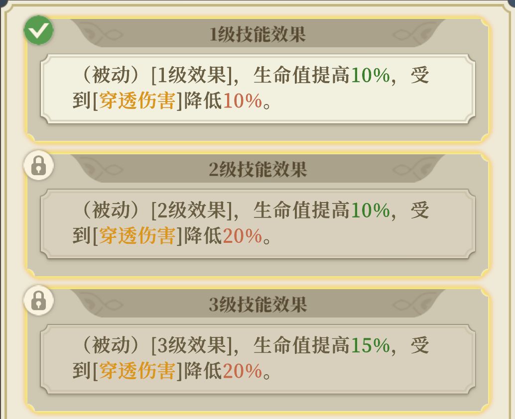 增益,受到下一次非持续伤害时,受到伤害或穿透伤害降低50%,生效后移除。