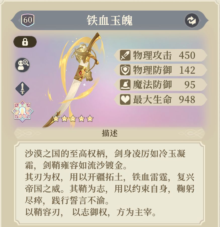 - 通用的剑类武器,提高生命值和物攻。